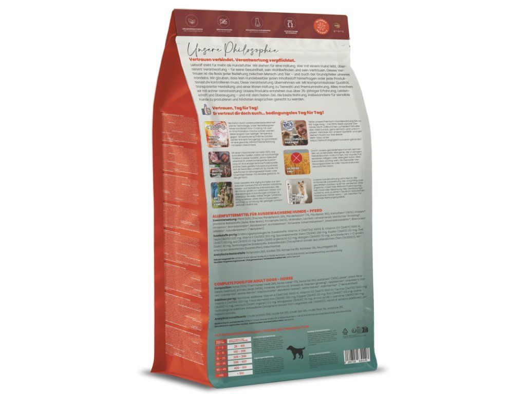 Složení: Kůň 52 % (z toho čerstvé koňské maso 26 %, sušené koňské maso 17 %, koňský tuk 9 %), brambory 30 %, hrášek, jablko, rostlinná vláknina, rostlinný protein, mannan-oligosacharidy (MOS), lososový olej, extrakt z rozmarýnu, sibiřský ženšen, malina, listy ostružiny, brusinka, bobule arónie, černý rybíz, pampeliška, kopřiva, bezinka.