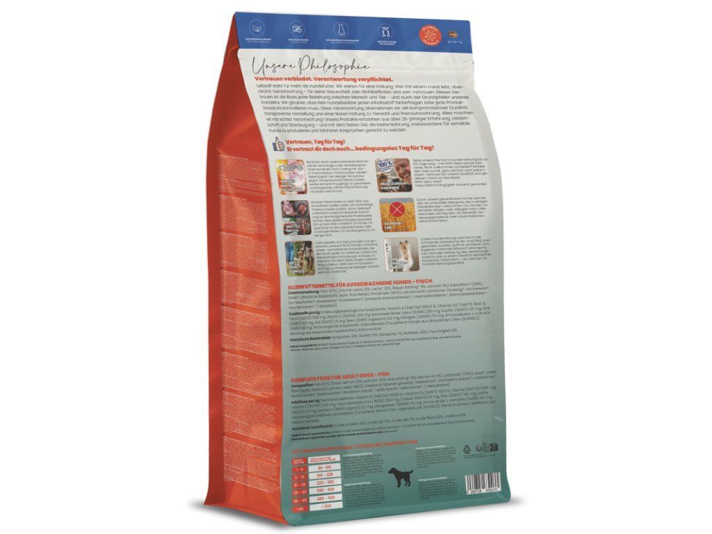 Složení: ryba 57 % (z toho čerstvý losos 25 %, sušený losos 20 %, sušená treska modravá 9 %, lososový olej 3 %), brambory 30 %, hrášek, jablko, mannan oligosacharidy (MOS), rostlinná vláknina, extrakt z rozmarýnu, sibiřský ženšen, malina, listy ostružiny, brusinka, bobule arónie, černý rybíz, pampeliška, kopřiva, bezinka.