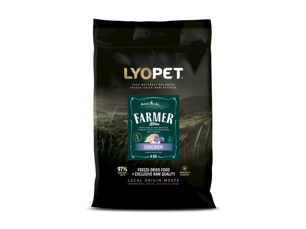 Lyopet Farmer je kompletní superprémiové krmivo pro koťata a březí kočky. Obsahuje kuřecí granule, šetrně zpracované za nízkých teplot a obalené v mase sušeném mrazem a BIO kolostru. Kvalitní granule pro koťata a kočky s vysokým obsahem masa, bez chemie a konzervantů.