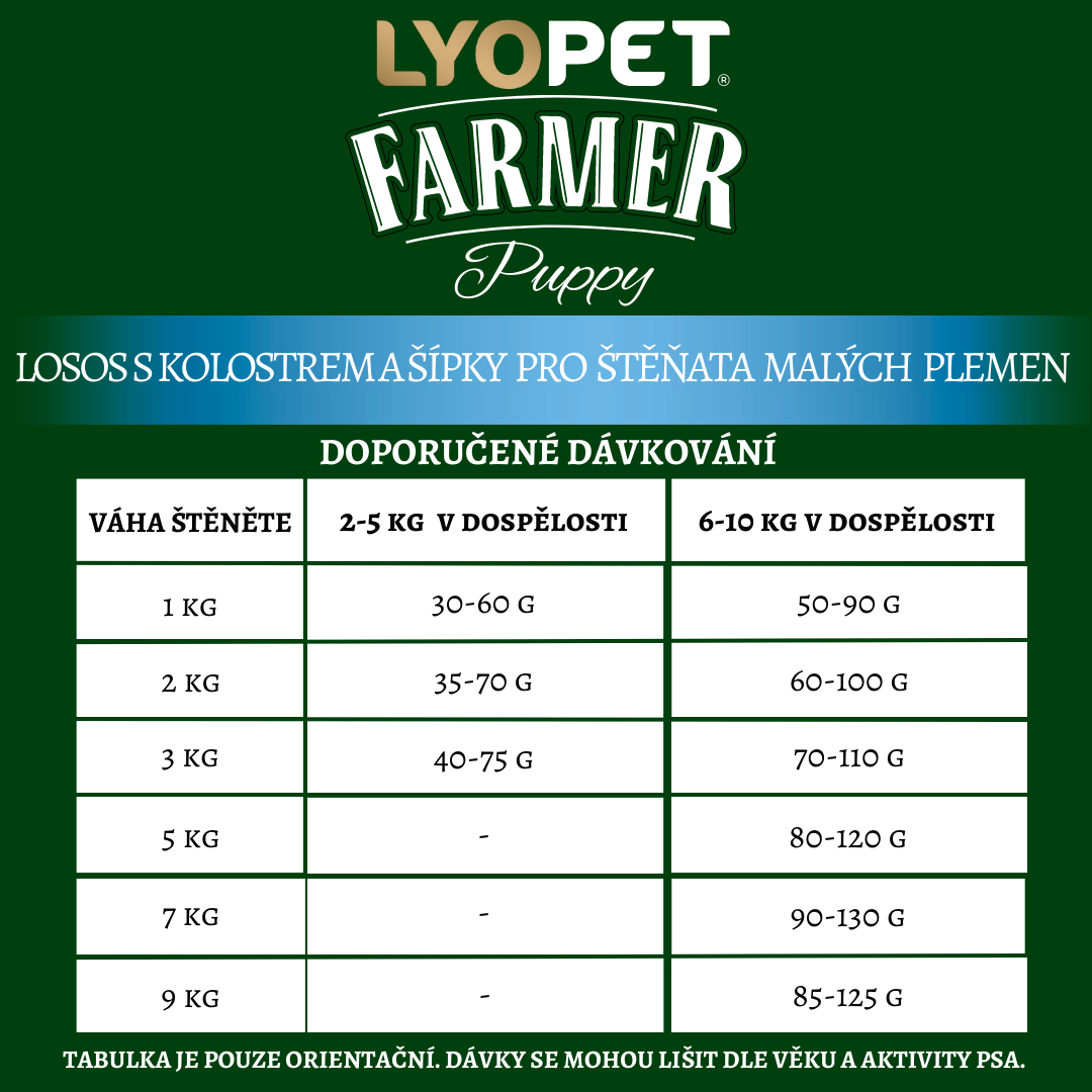 Lyopet Farmer je kompletní superprémiové krmivo, speciálně navržené pro štěňata malých plemen. Obsahuje lososové granule, šetrně zpracované za nízkých teplot, obalené v mase sušeném mrazem a v BIO kolostru. Nejlepší granule pro štěňata s vysokým obsahem masa, bez chemie a konzervantů. Vhodné od 6-7 týdnů věku štěněte.