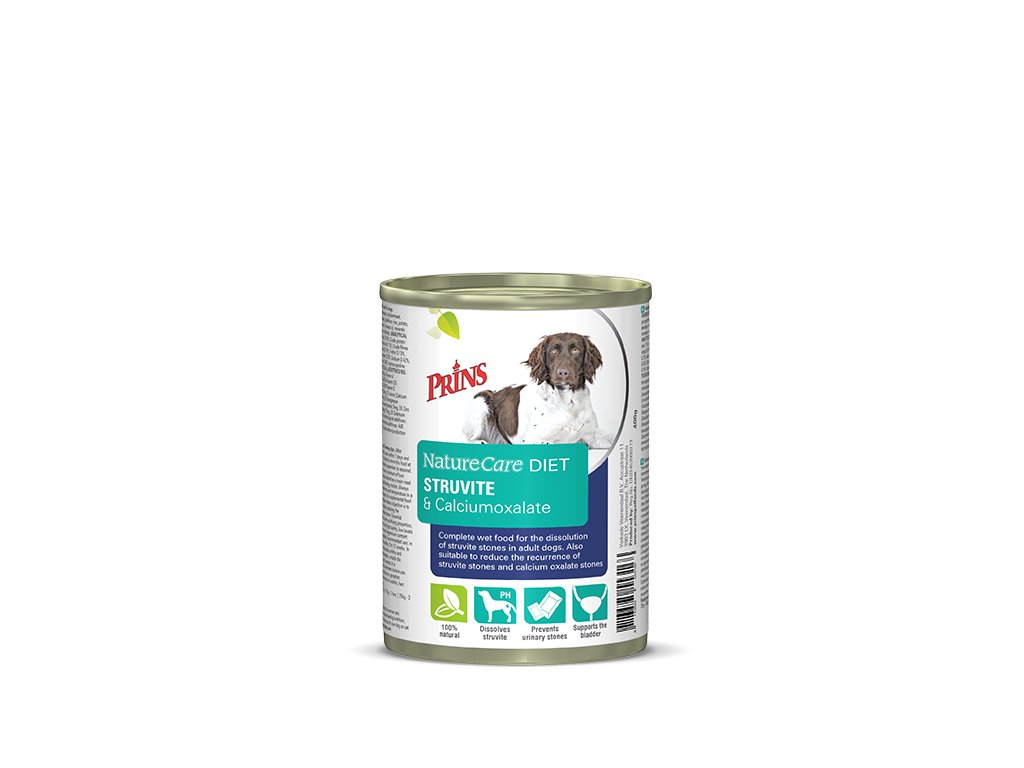 NatureCare Diet Dog Struvite & Calcium Oxalate je mokré krmivo pro psy s problémy s močovým měchýřem. Toto speciální dietní krmivo bylo vyvinuto ve spolupráci s veterináři a má jak rozpouštěcí, tak preventivní účinek. Toto dietní krmivo je vhodné k rozpouštění struvitových močových kamenů a oxalátových močových kamenů a k prevenci jejich opakované tvorby. Mokré krmivo zajišťuje zvýšený příjem vlhkosti, což zvyšuje objem moči. Tím se snižuje koncentrace minerálů tvořících krystaly v moči, což pomáhá udržovat zdravé močové cesty.