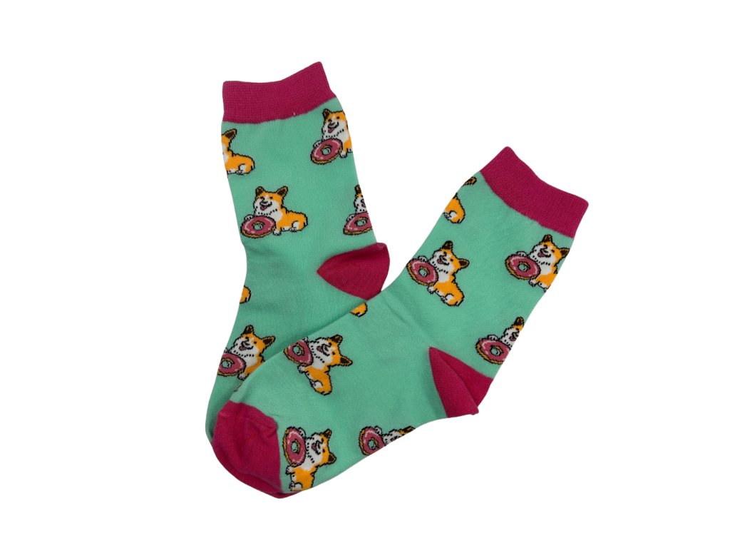 - tyrkysové ponožky s corgi a růžovými donuty