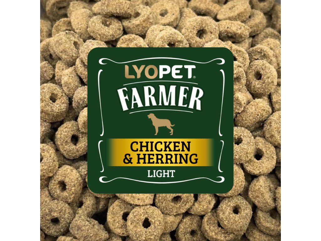 Lyopet Farmer Light Chicken & Herring (Kuře s herynkem) je kompletní superprémiové krmivo vyvinuté pro podporu zdraví dospělých psů a psích seniorů. Vysoký podíl masa zahrnuje čerstvé masa z kuřete a herynka, šetrně zpracované za nízkých teplot a obalené v mrazem sušeném mase, aby si zachovalo maximum živin i chuti. Přidané kolostrum podporuje přirozenou obranyschopnost díky imunoglobulinům.